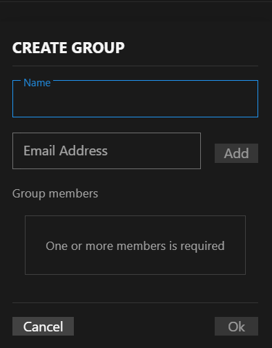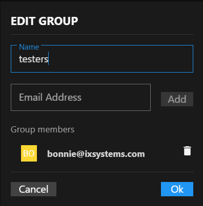 icon, and the name of the group. The expanded view of the group shows the email(s) associated with the group member(s).Edit Group dialog.