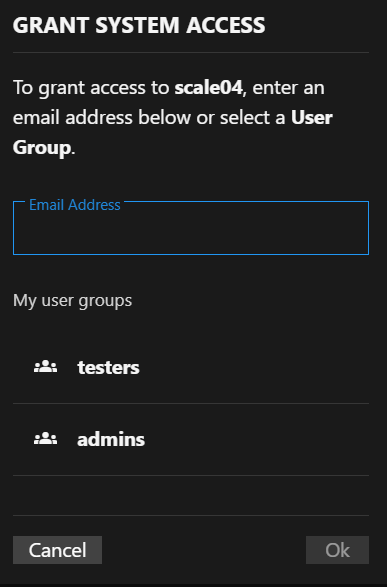 Ok saves the changes made, and initiates sending the invitation to the specified email. Cancel closes the dialog without saving or sending the invitation email.