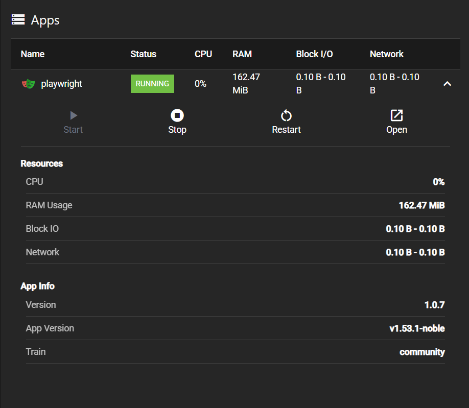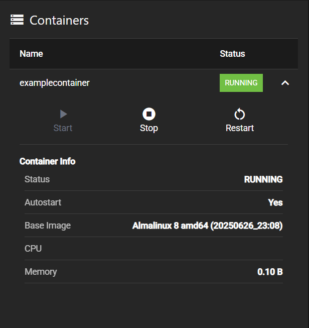 - Autostart: Indicates whether the container starts automatically (Yes)
