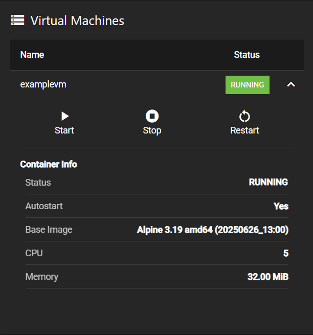 - Autostart: Indicates whether the VM starts automatically (Yes)