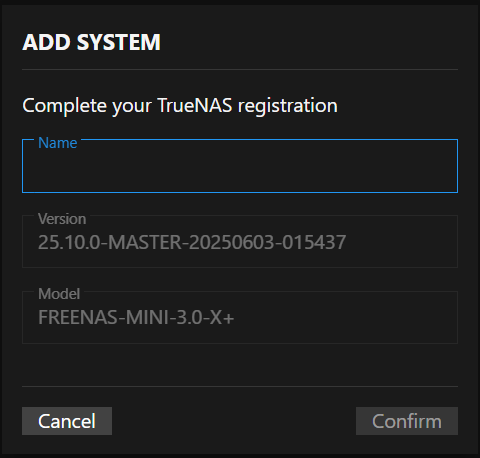 Confirm adds and registers the TrueNAS system as the name entered. Cancel closes the Add System dialog without adding or registering the TrueNAS system.