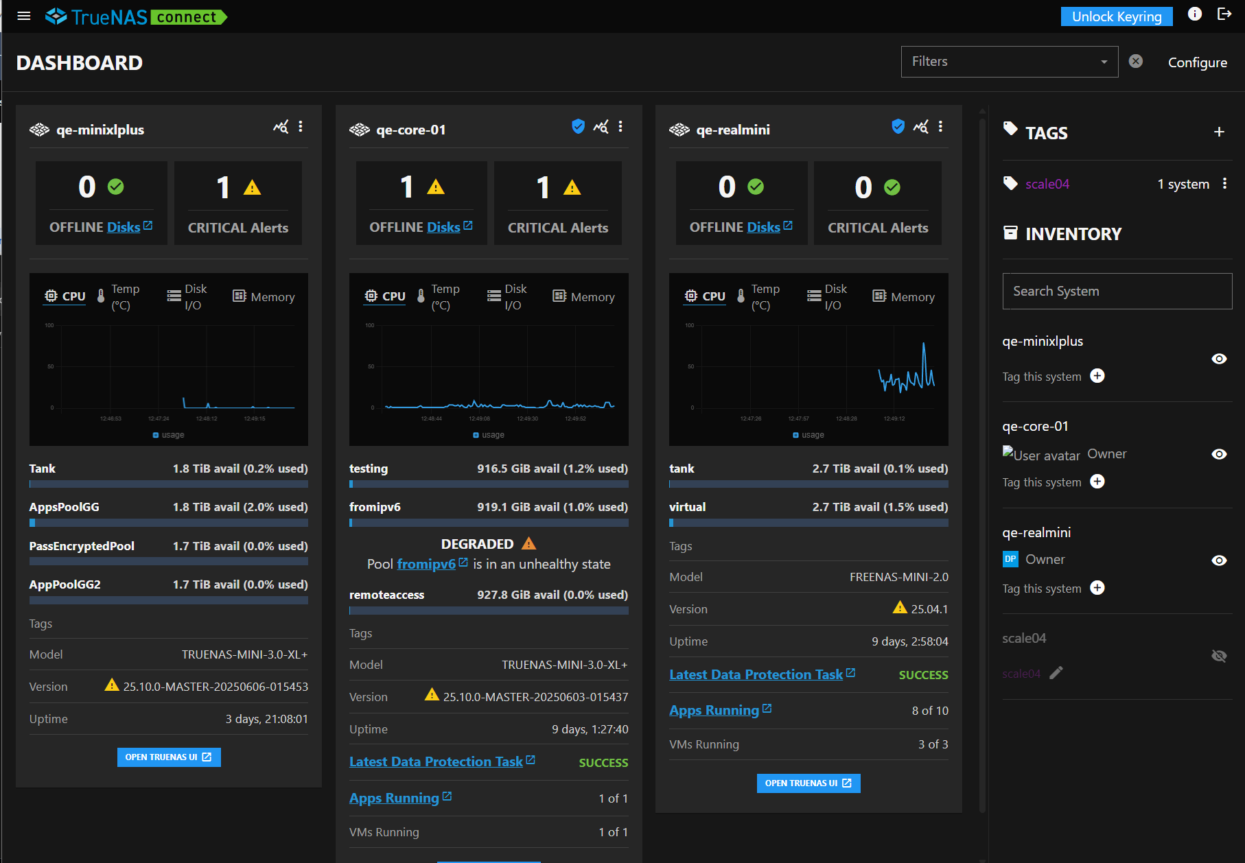 Inventory, in the Dashboard right side panel, shows individual system items for systems in TrueNAS Connect.