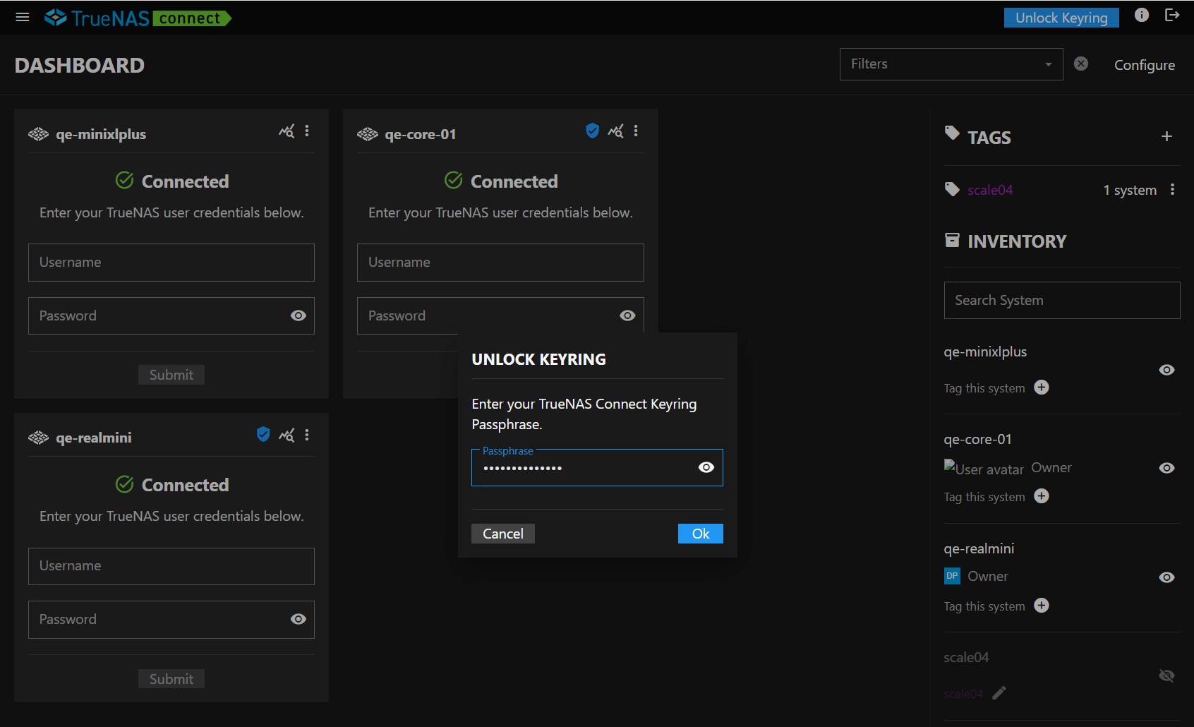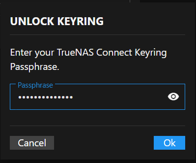 The Unlock Keyring dialog shows when you sign into TrueNAS Connect if you created a keyring to authenticate your registered (added) system.