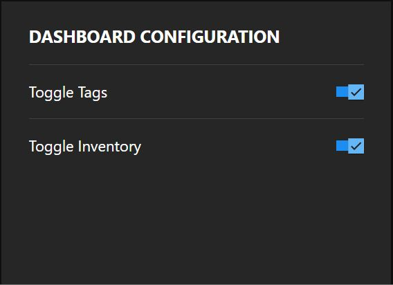 The Dashboard Configuration dialog shows two options that determine whether Tags and/or Inventory show in the right side panel of the Dashboard screen.