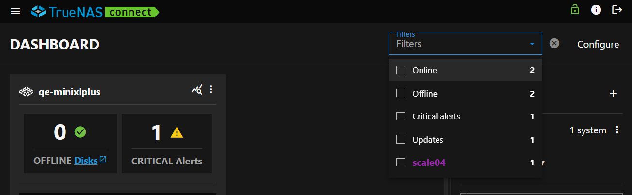 The Filters field at the top of the Dashboard screen shows a dropdown list of filter options. The options narrow a search of systems to those matching the selected options. Filter options are: Online, Offline, Critical Alerts, Updates, and tag names (labels) added to systems in the service.