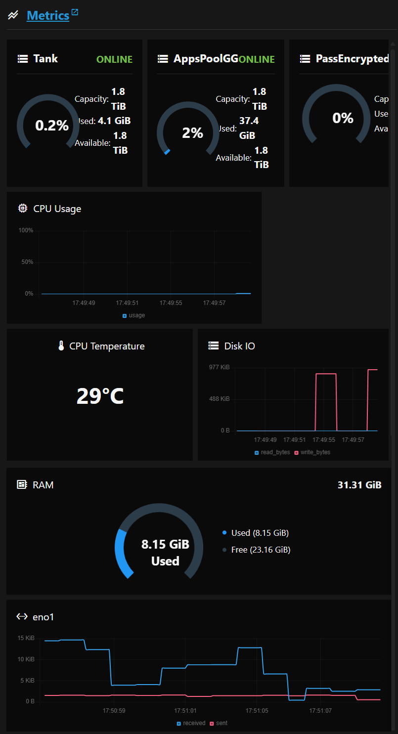 The Metrics panel shows real-time graphs of storage, system, and network resources in the TrueNAS system This link opens the Reporting screen in the TrueNAS UI.
