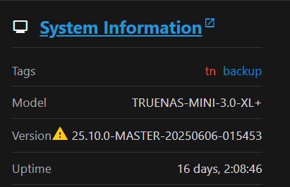 - Version - The current TrueNAS release for the system. An update badge indicates when an update is available for the TrueNAS system.