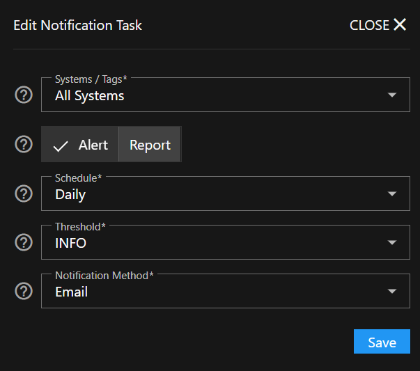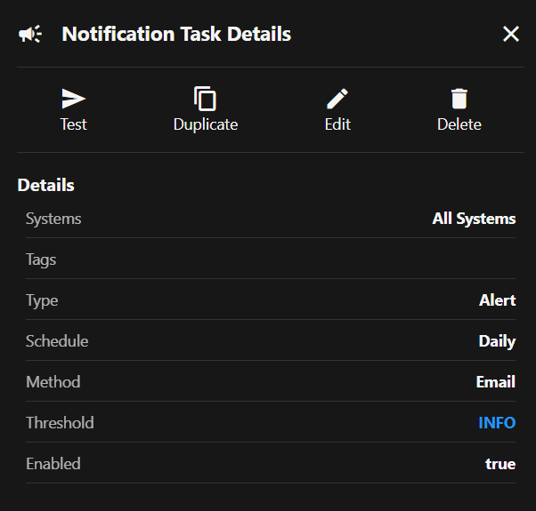 - Threshold: Alert severity level with color coding (INFO, CRITICAL)
