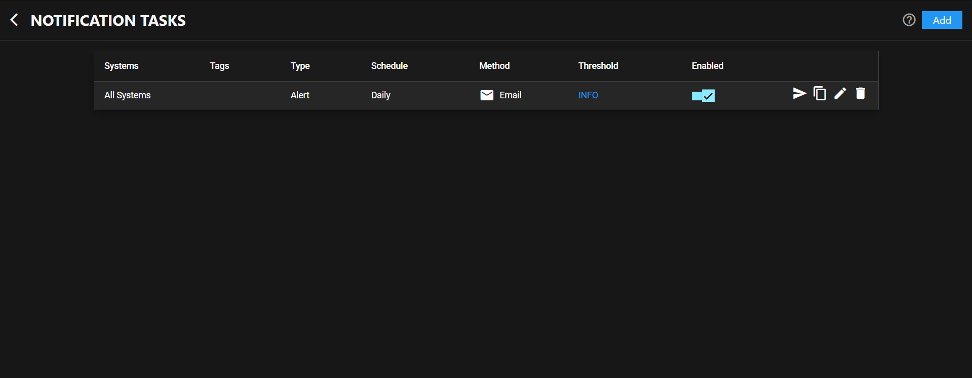 Action buttons provide task management functionality and are available on the right side of each entry in the Notification Tasks table: